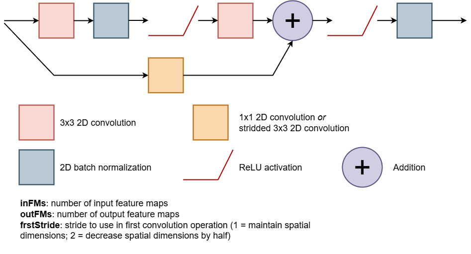 - If the first convolution block uses a stride of 2 and the number of input feature maps and output feature maps are different, a projection connections should be used where the number of feature maps and the spatial dimensions are altered to match the number of output feature maps and spatial dimensions along the main path using 3x3 2D convolution with a stride of 2 and a padding of 2. This output should then be added to the output of the second convolution block in the main path.