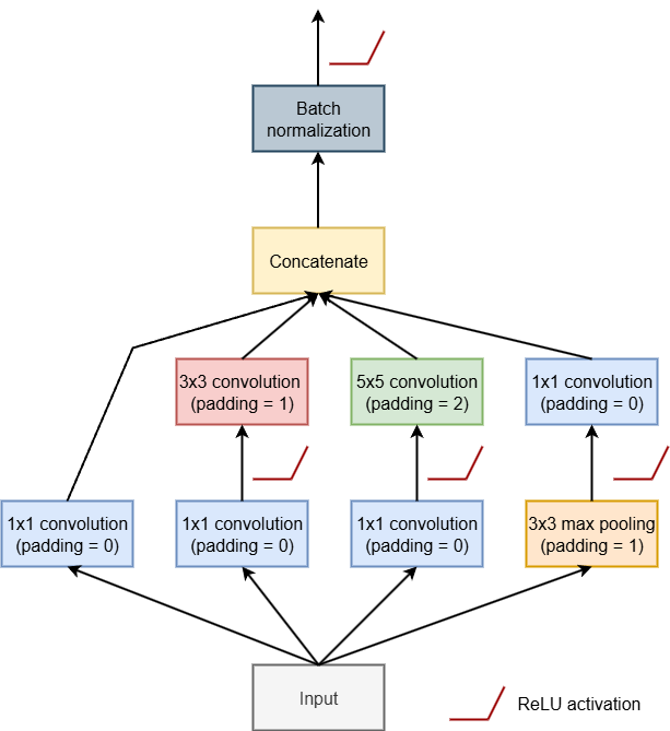 , The goal of this block is to capture patterns at different spatial scales by processing the input data using different window sizes along different branches of the architecture. The feature maps generated by the different branches are then concatenated or stacked. Note that the spatial dimensions sizes should not change throughout the architecture. We have also noted where ReLU activation functions should be applied. You only need to apply batch normalization after the concatenation of the final set of feature maps. As with the residual block, doing some background research on InceptionNet and Inception blocks may be useful prior to attempting to generate the block.