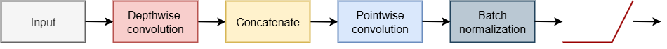 Depthwise separable convolution is a common component of efficient CNN architectures, such as those from the MobileNet family. This process consists of two components: depthwise convolution and pointwise convolution. In contrast to traditional convolution blocks, depthwise convolution learns separate feature maps for each input feature map, as opposed to applying all learned feature maps to every input feature map. The results are then concatenated or stacked and passed to a pointwise convolution layer where the output of depthwise component is further processed. Depthwise convolution is generally implemented using 3x3 2D convolution. If the groups