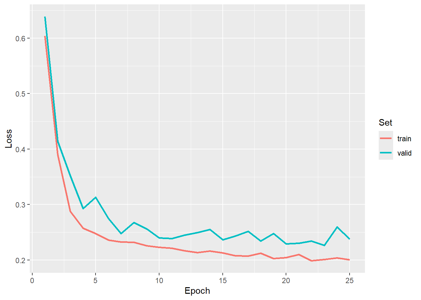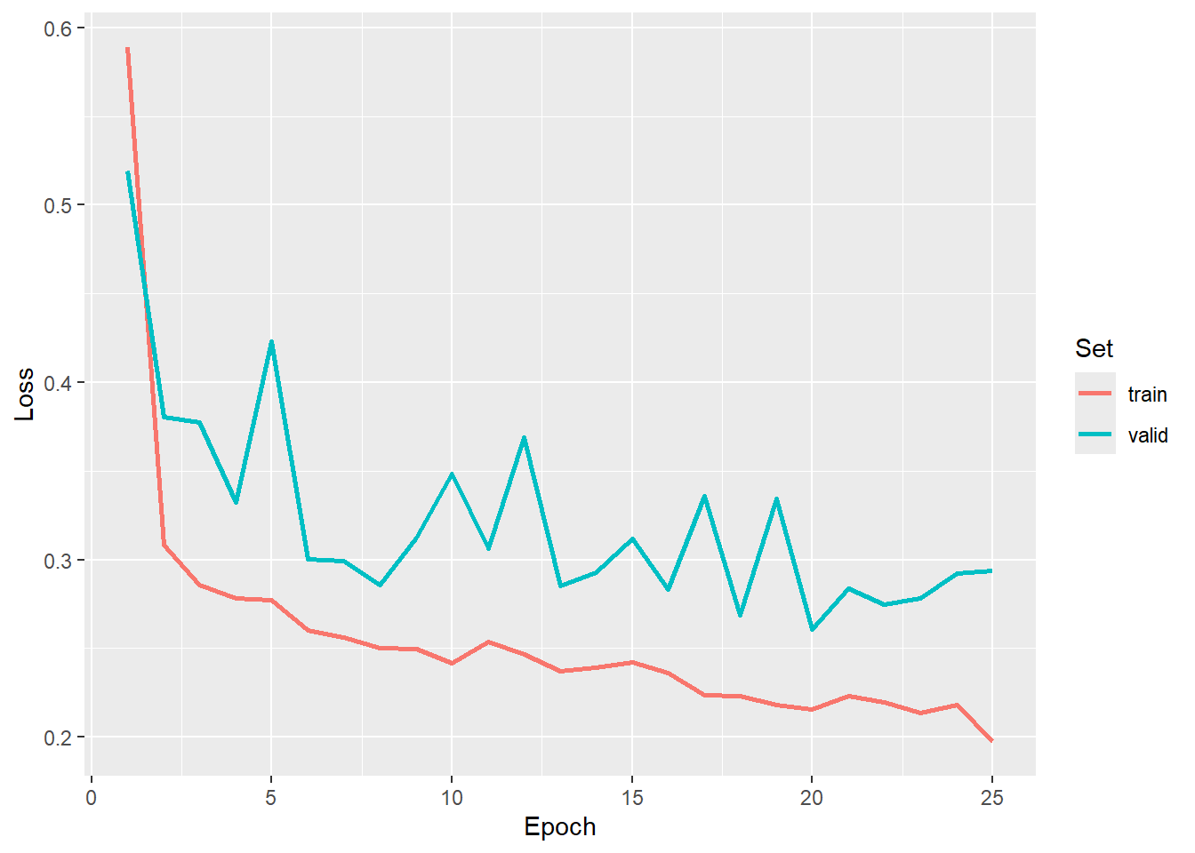 . - Train a model using luz. Use the training dataloader to train the model and the validation dataloader for validation. Use a UNet3+ model via