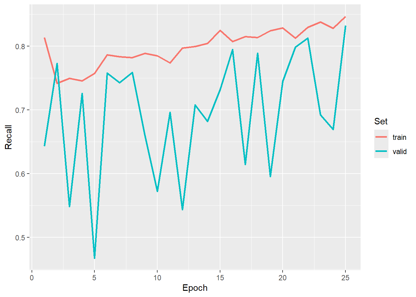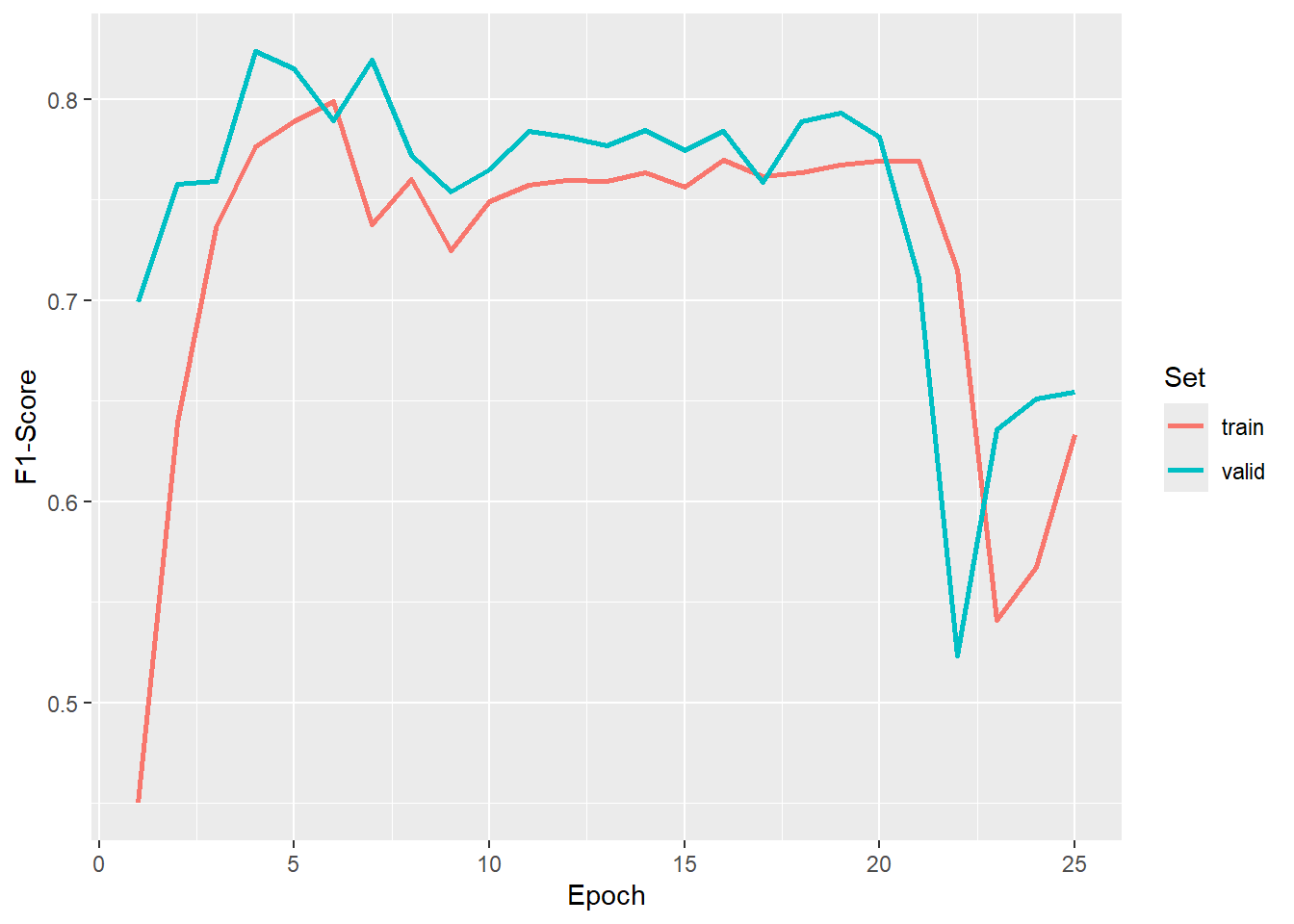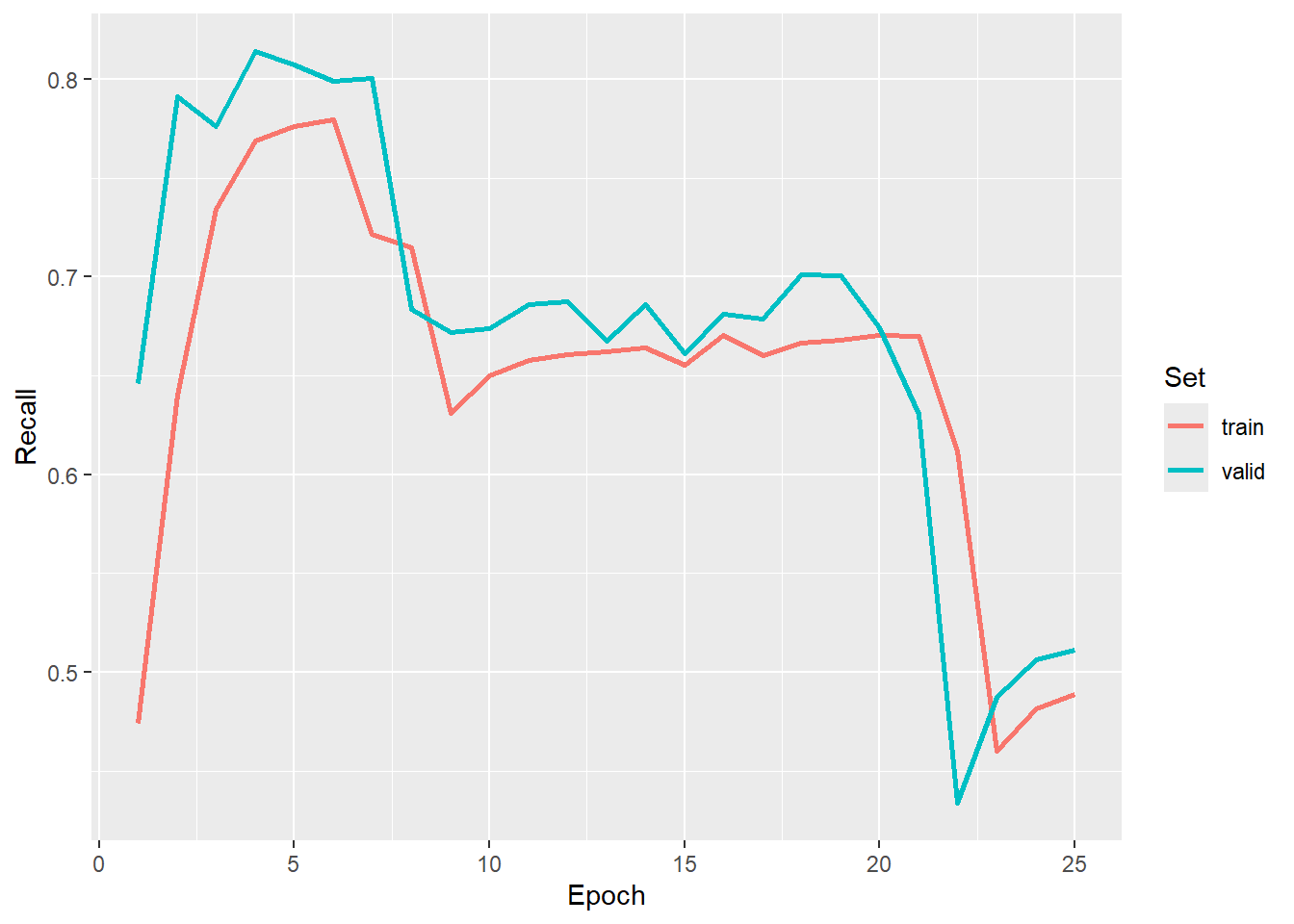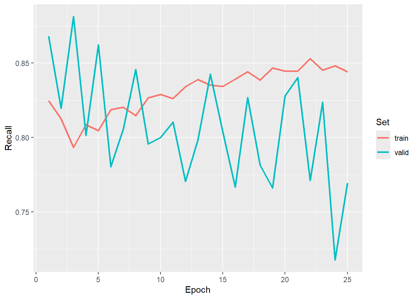 . Monitor overall accuracy, F1-score, recall, and precision. Make sure to parameterize F1-score, recall, and precision as expected for a binary classification usingclsWghts=c(0,1)