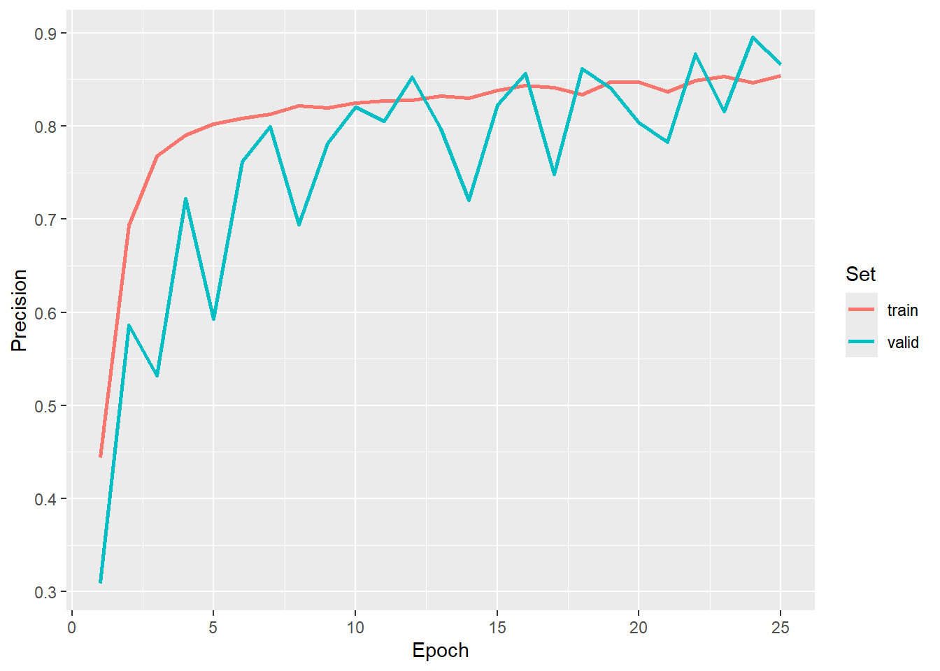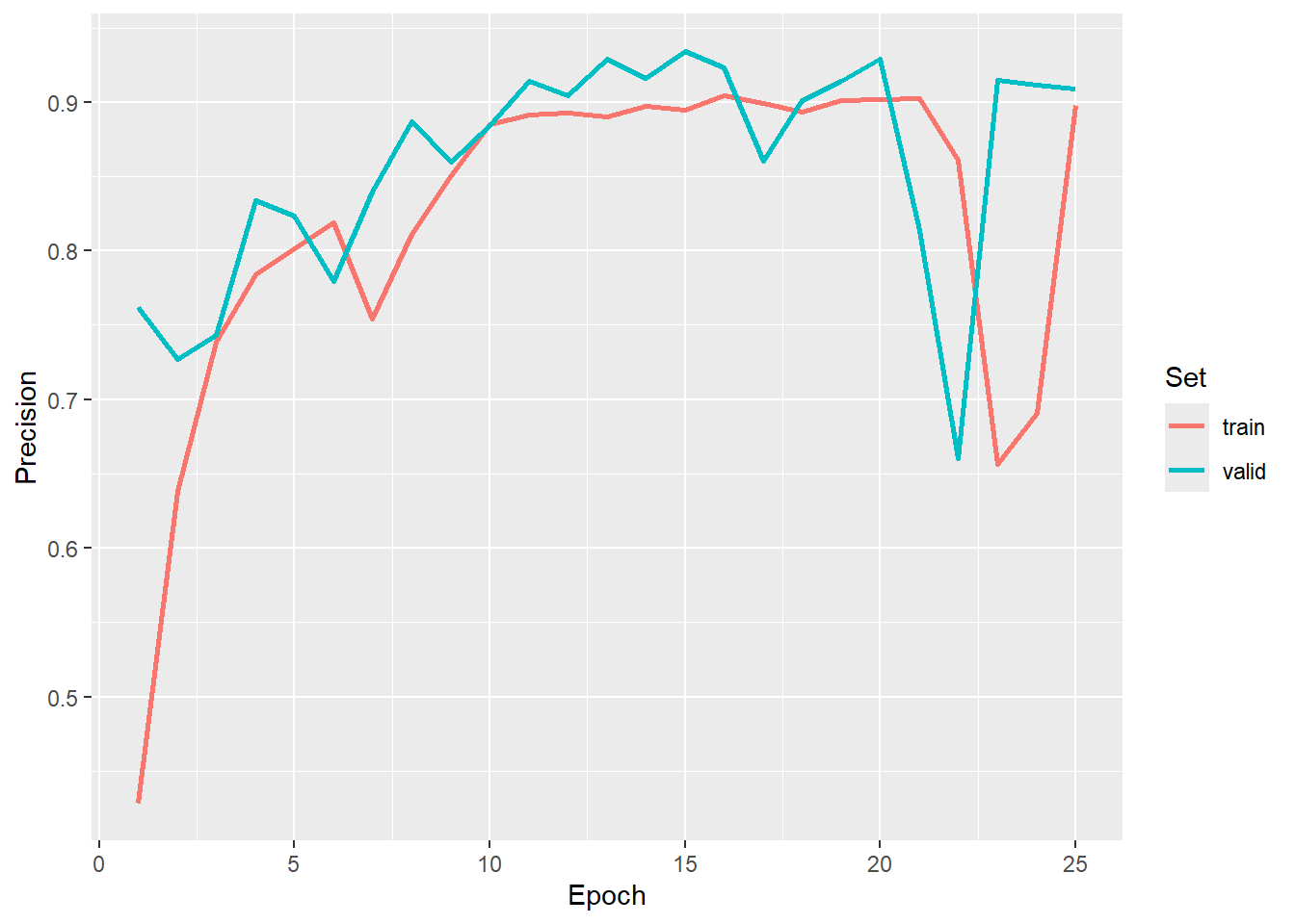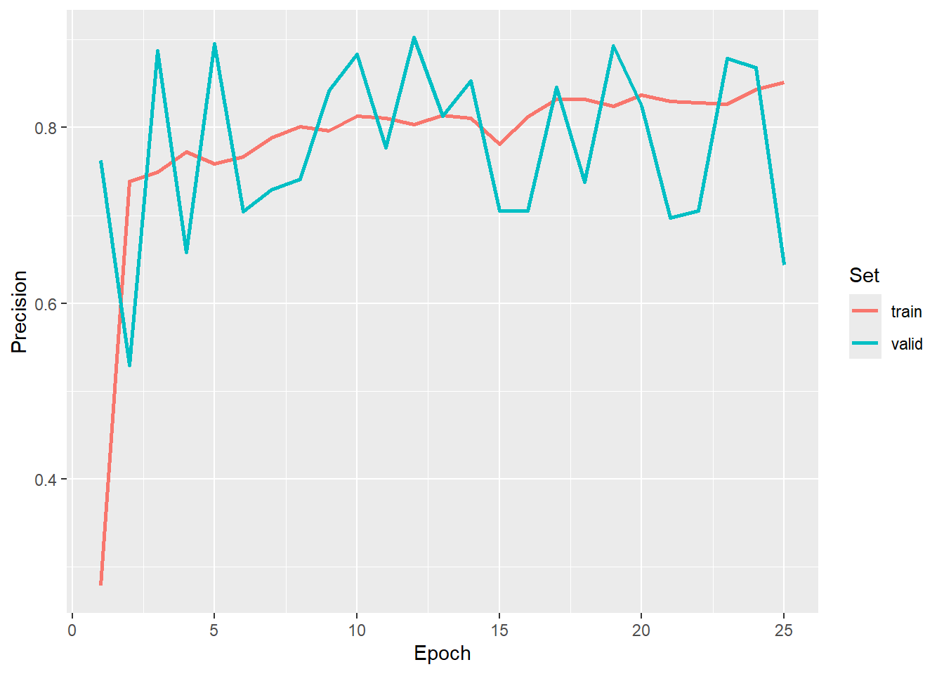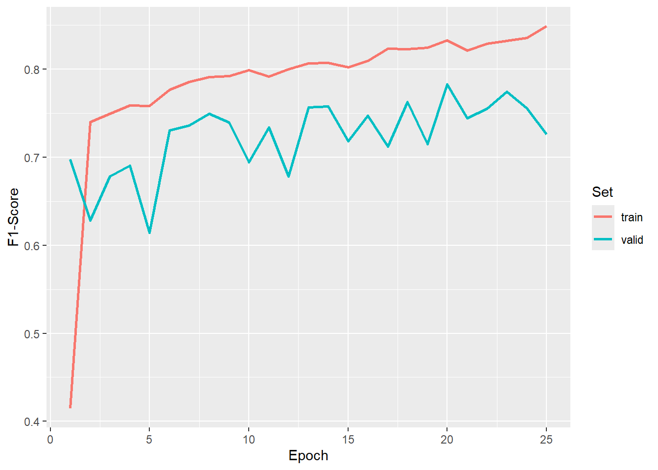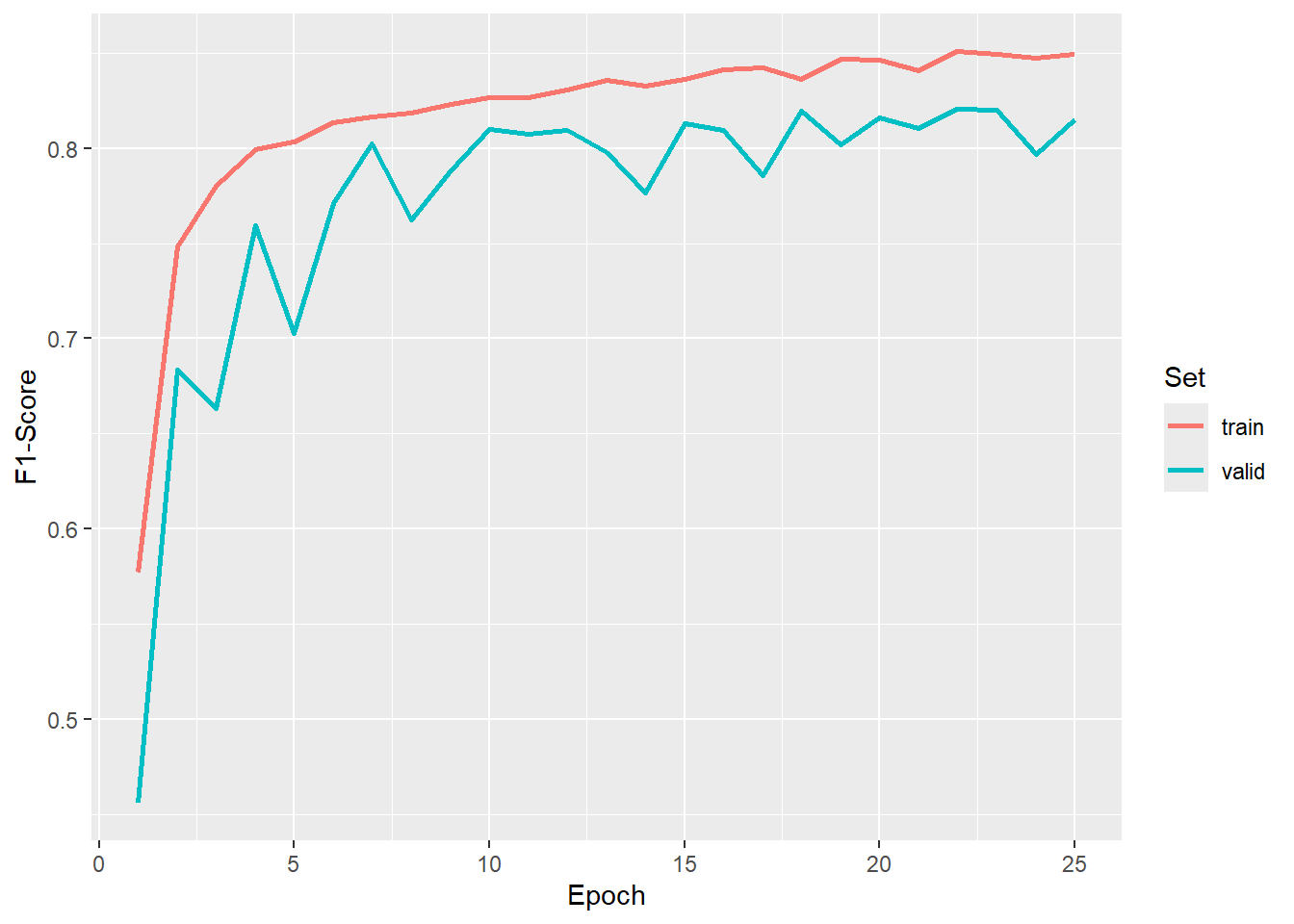 . Monitor overall accuracy, F1-score, recall, and precision. Make sure to parameterize F1-score, recall, and precision as expected for a binary classification usingclsWghts=c(0,1)