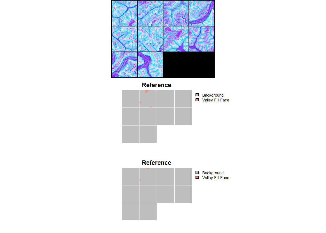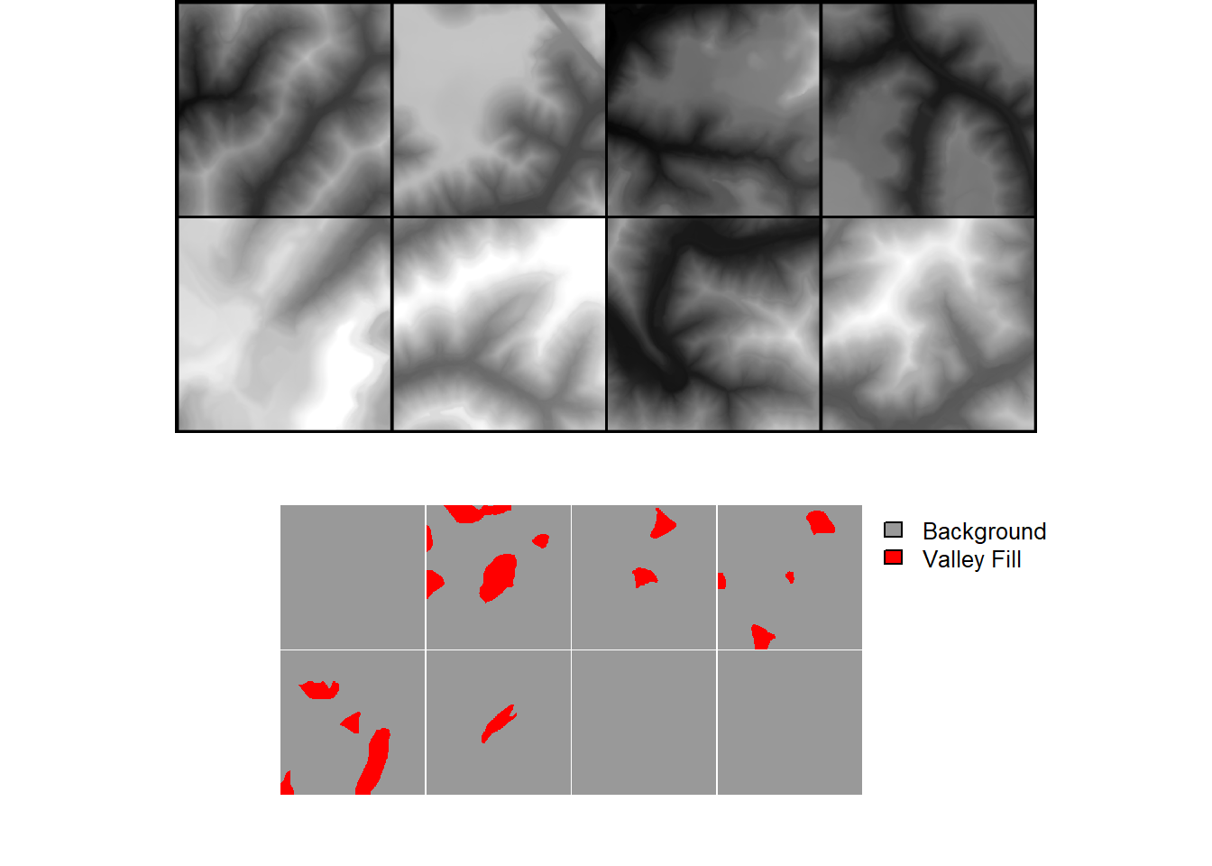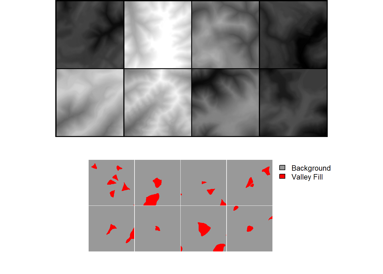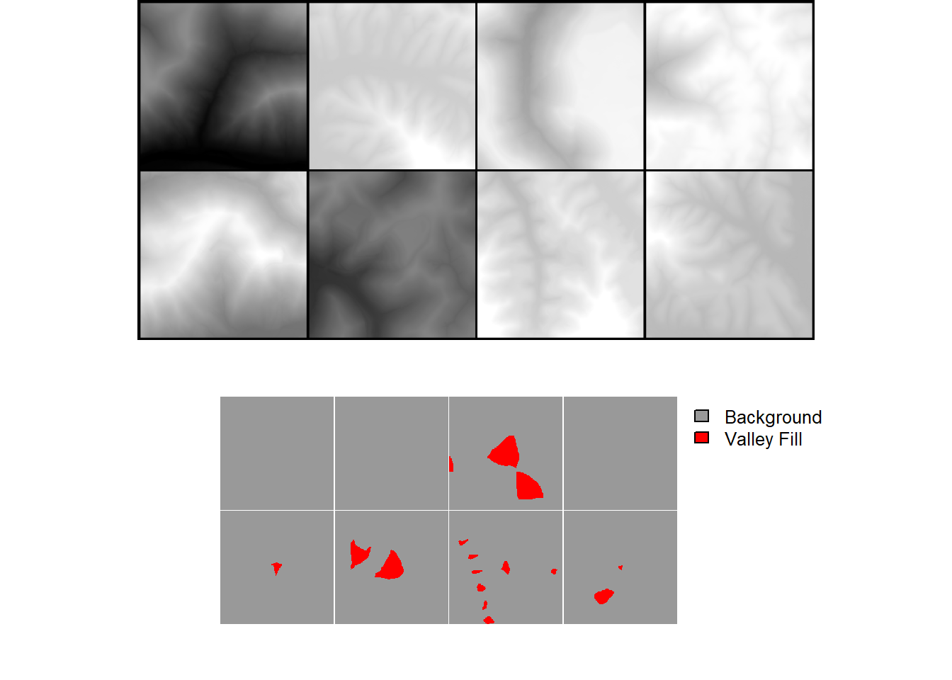 function without issue. For the training set, we only use chips with at least one cell mapped to the positive case. We also shuffle the data to potentially reduce autocorrelation. For the validation and test datasets, we use all chips, including those that only include background features. We include the background-only chips to make sure we are evaluating a wide variety of landscape examples that could be potential false positives (FPs). Since valley fill faces make up a small percentage of the landscape, there is a large number of chances for FPs.