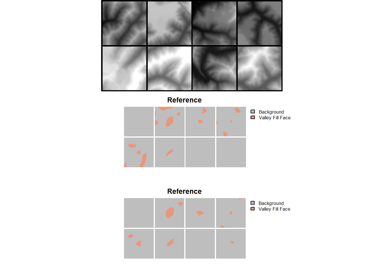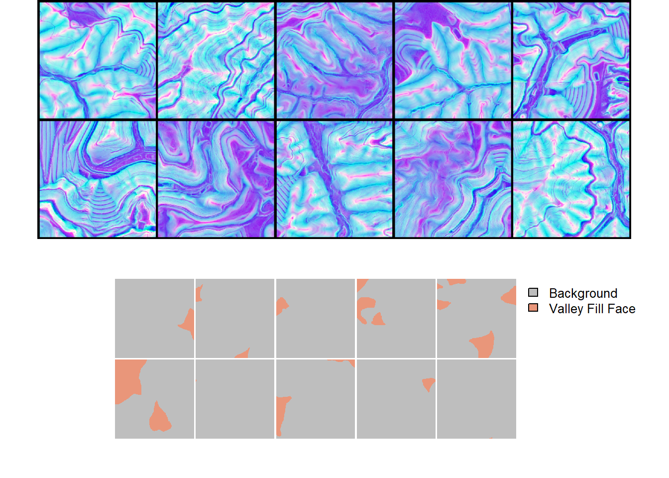 In the last chapter, we described the functionality of the geodl package. In this chapter, we use its components to implement complete deep learning (DL) workflows. In the first workflow, we use the vfillDLMini dataset, which includes a set of pre-built image chips and associated masks. The goal is to extract valley fill face anthropocentric geomorphic features using digital terrain model (DTM)-derived land surface parameter (LSP) predictor variables. Valley fill faces are remnants of surface coal mine reclamation resulting from placing displaced overburden rock material in mine-adjacent valleys. Three predictor variables are included. The first band is a topographic position index (TPI) calculated using a moving window with a 50 m circular radius.The second band is the square root of slope calculated in degrees. The third band is a TPI calculated using an annulus moving window with an inner radius of 2 meters and an outer radius of 5 meters. The TPI values are clamped to a range of -10 to 10 then linearly rescaled from 0 and 1. The square root of slope is clamped to a range of 0 to 10 then linearly rescaled from 0 to 1. Values are provided in floating point. This means of representing digital terrain data was proposed by Drs. Will Odom and Dan Doctor of the United States Geological Survey (USGS) and is discussed in the following publication, which is available in open-access: