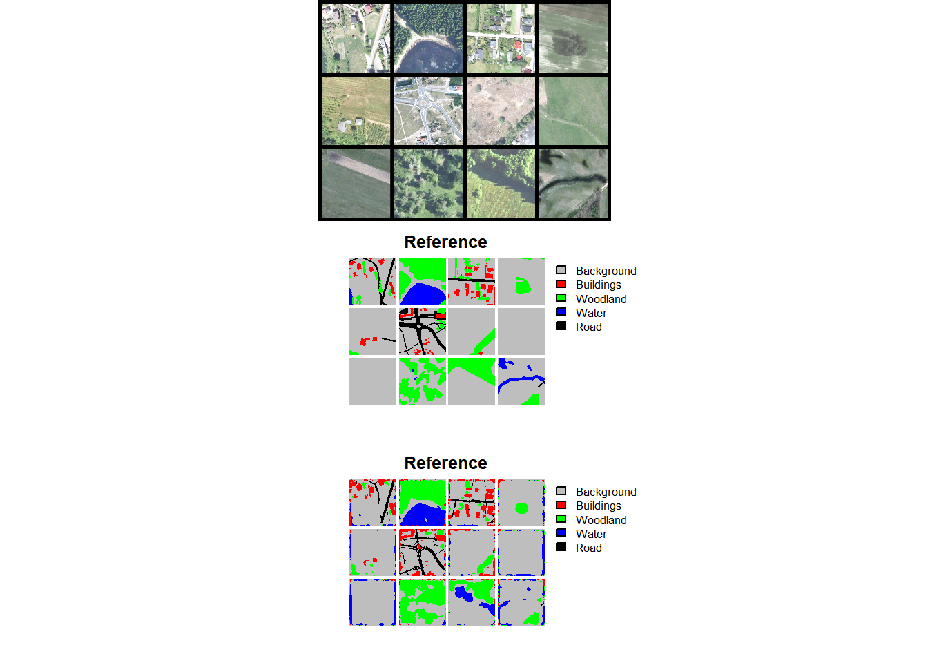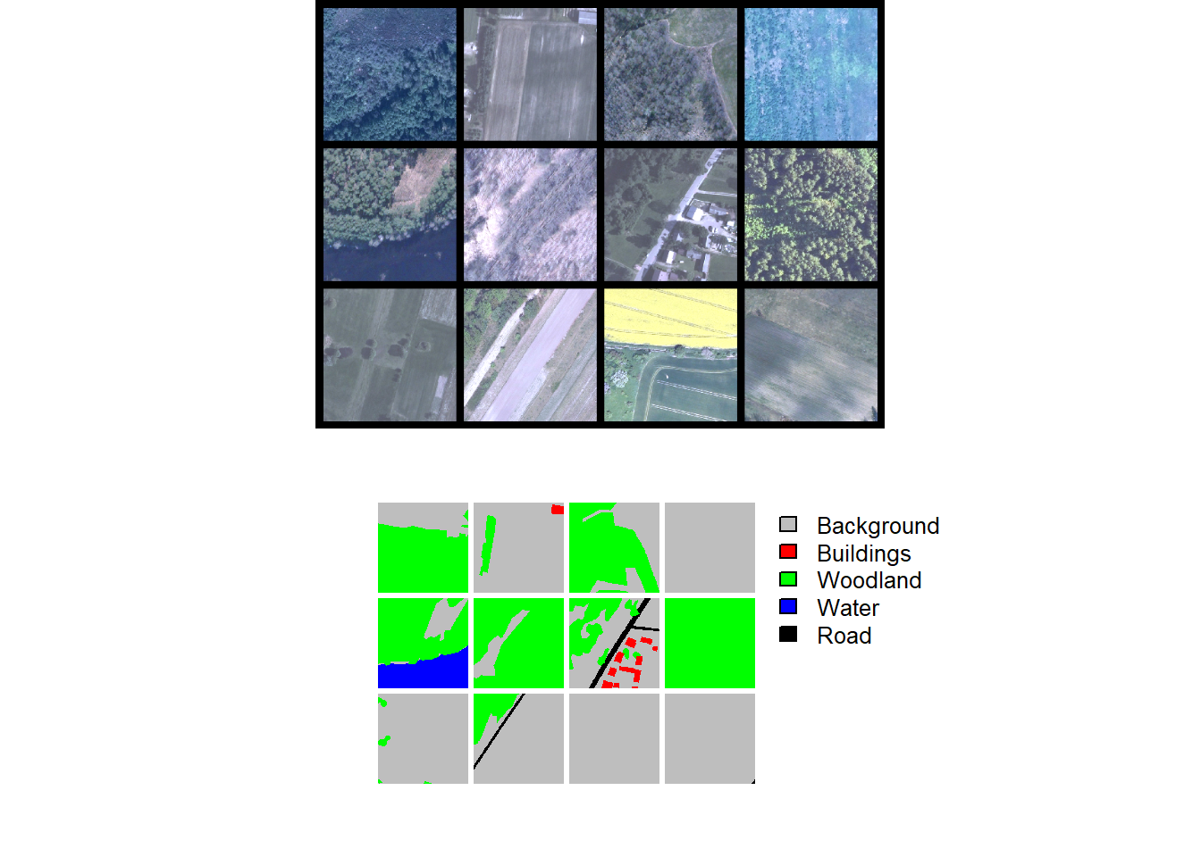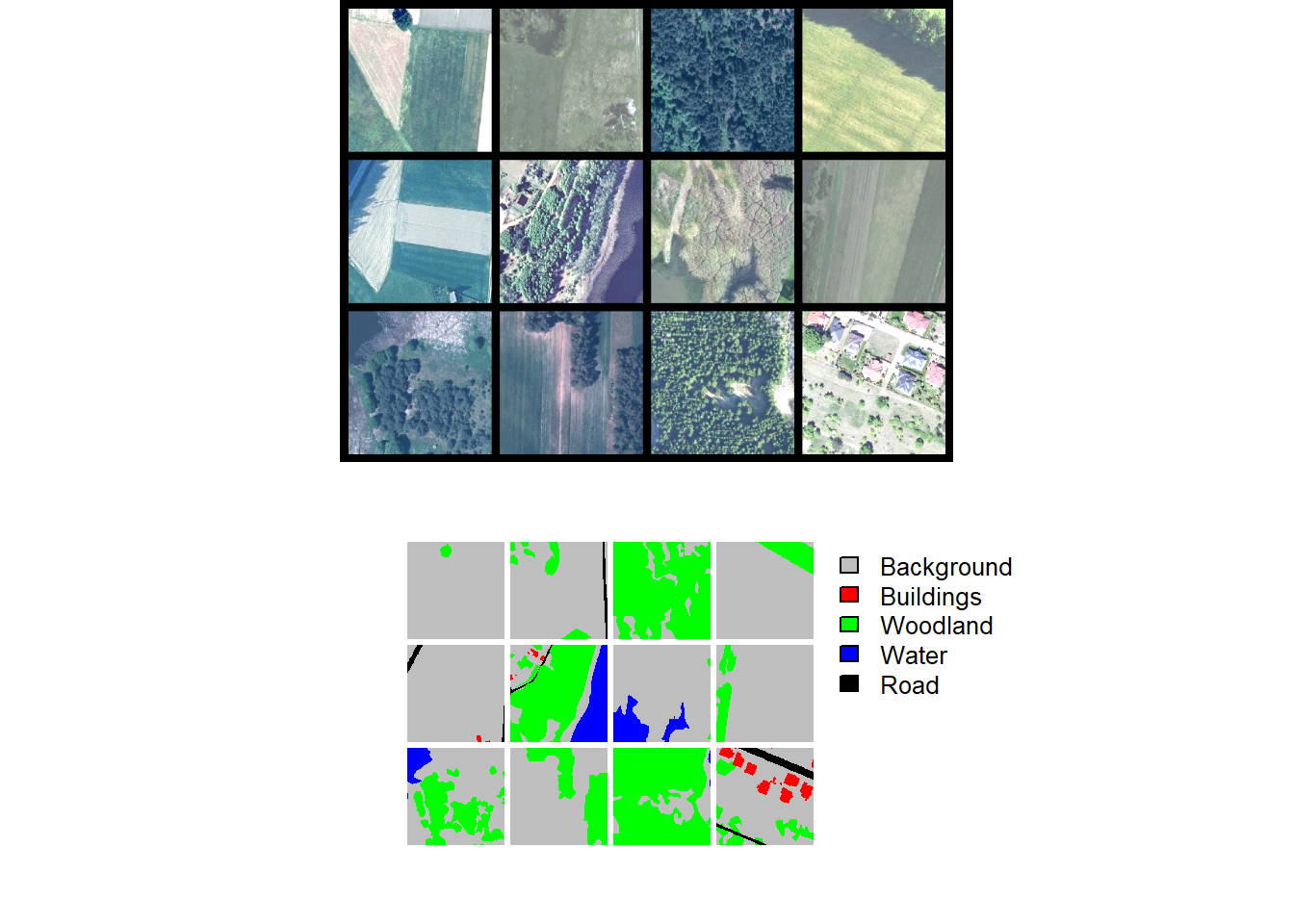 The first two workflows explore a binary classification problem. The final workflow explores a multiclass classification problem focused on land cover mapping. We specifically use version 1 of the landcover.ai dataset, which is available at this link. Five classes are differentiated: Background, Building, Woodland, Water, and Road. The data originators provide a Python script to split the images and associated raster masks into 512x512 cell chips and have already defined training, validation, and testing partitions, which are listed into provided CSV files. The processing script is also available at the link provided above. The data were introduced in the following paper: