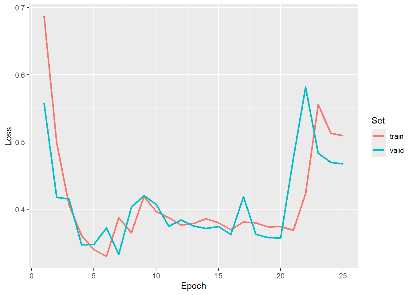 As with the prior two workflows, we first visualize the losses and metrics over the training epochs. Some instability is noted towards the end of the model. We use the model state after epoch 7 as the final model.