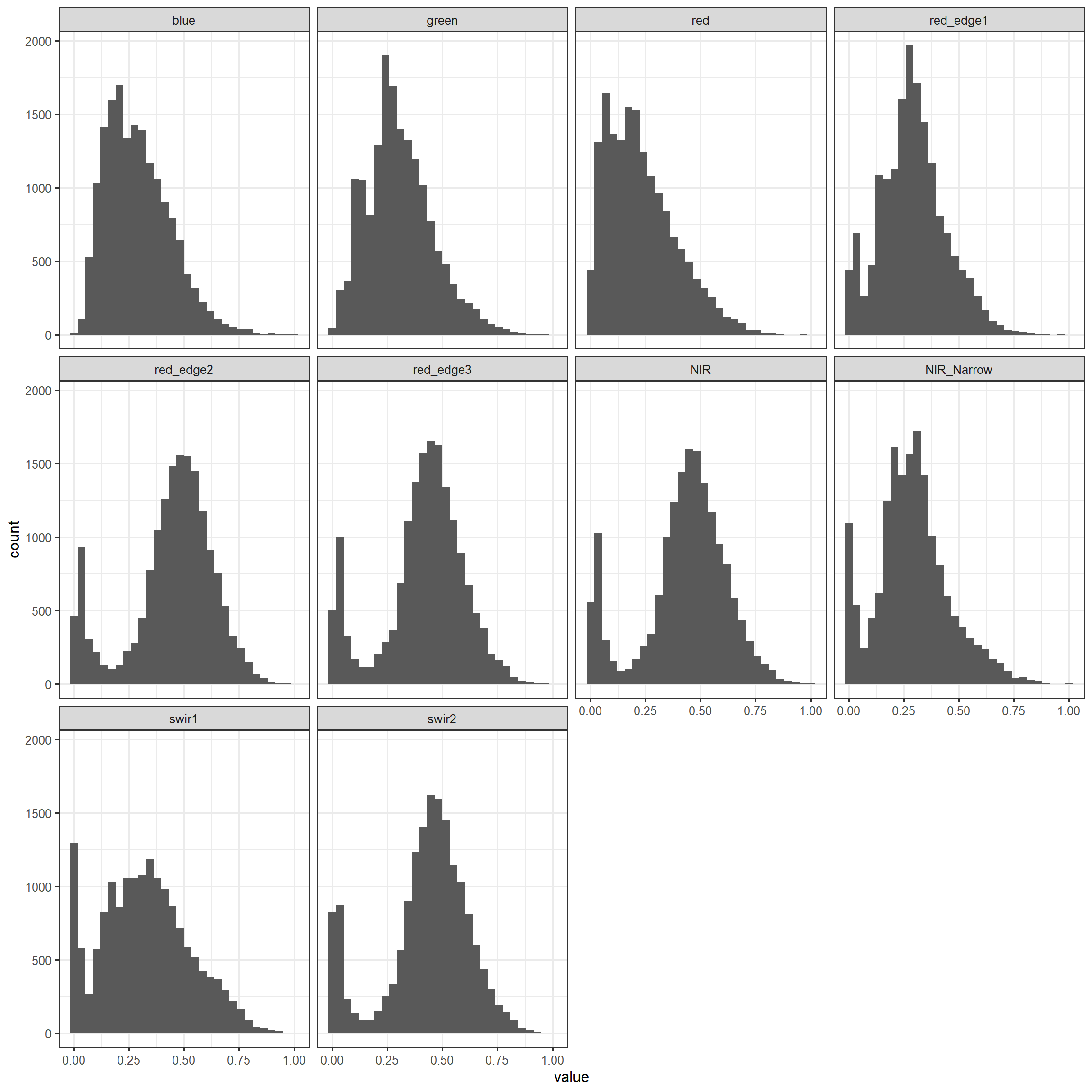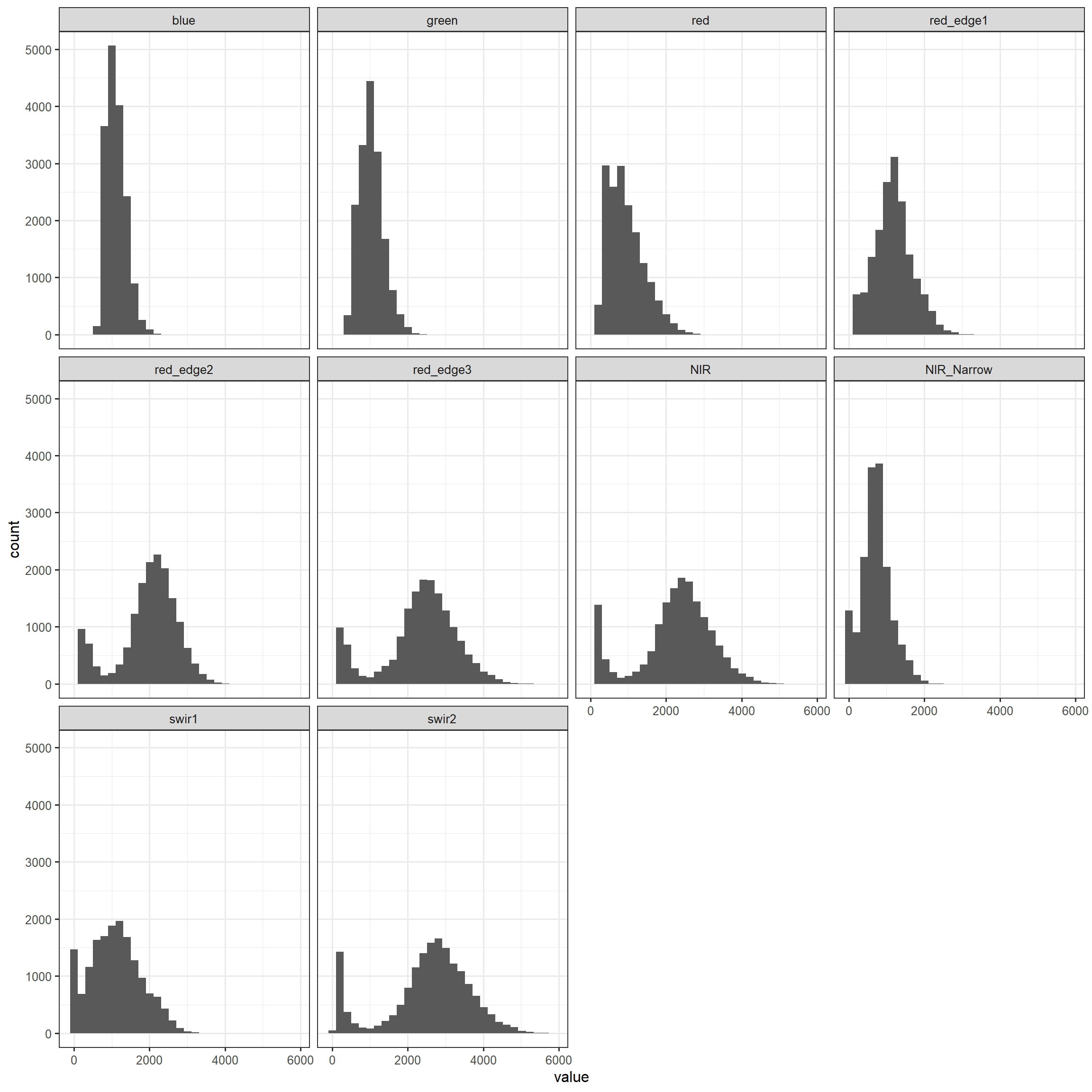 Below, we have created histograms to show the distribution of each image band. Since the tibble is not in the correct shape to create the graph, melt()