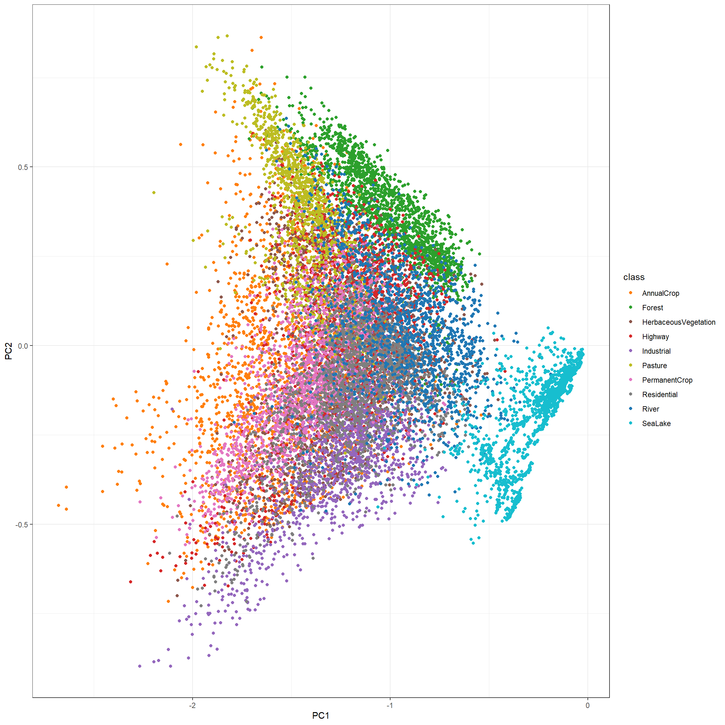 It is generally a good idea to explore your data prior to performing any preprocessing or feature engineering or before using them in a modeling workflow. For classification tasks, and especially multiclass classification, class imbalance is often of concern. Using dplyr, we count the number of records or rows belonging to each class. The number of samples per class varies between 1,200 (pasture) to 2,158 (sea/lake). There does not appear to be a high degree of class imbalance. However, if class imbalance were an issue, some means to combat this may be considered, such as oversampling the minority class, generating synthetic samples, or using a class-weighted loss metric.