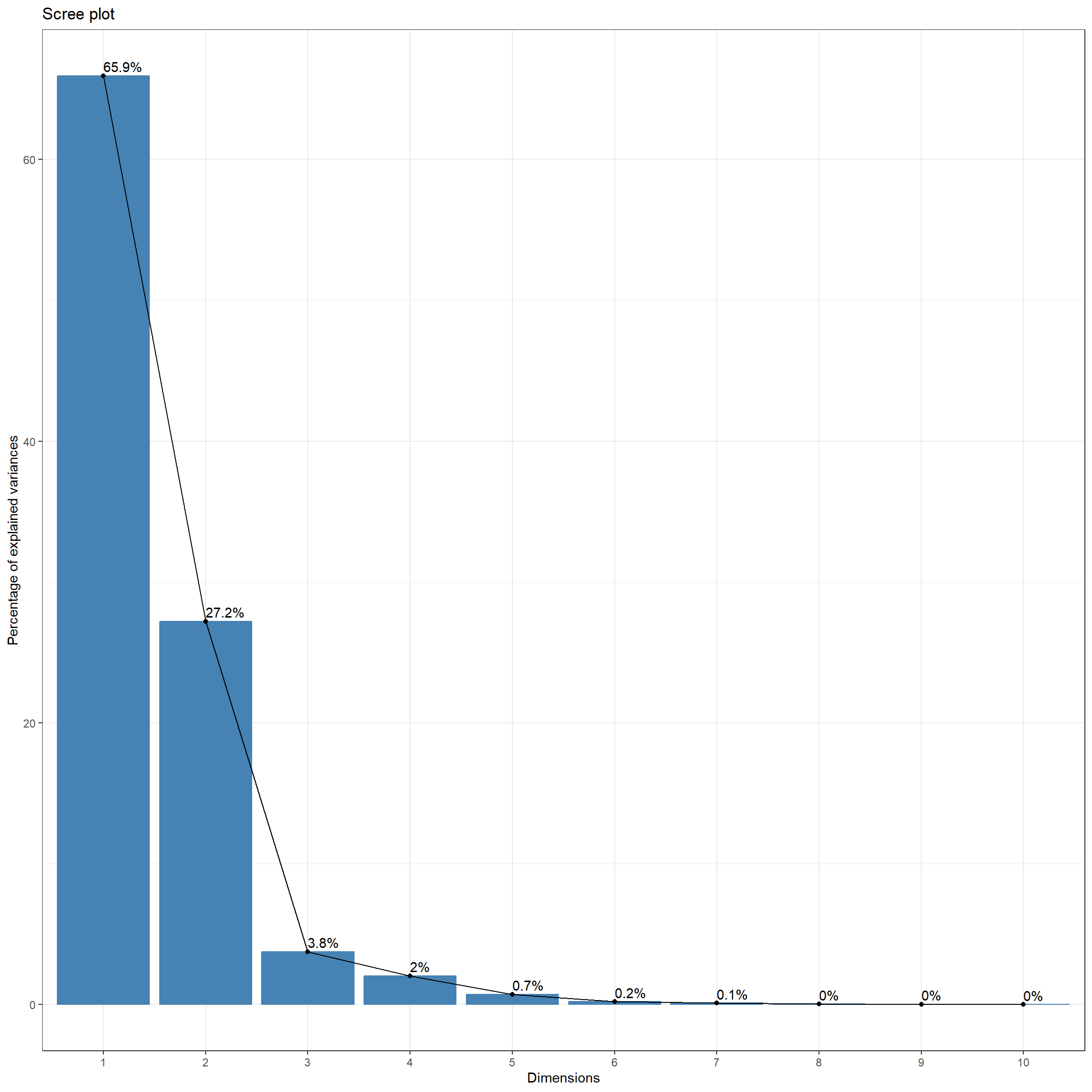 function from the factoextra package generates a Scree plot, which shows the proportion of the variance explained by each principal component. Again, the majority of the variance in the original data is captured by the first two principal components.