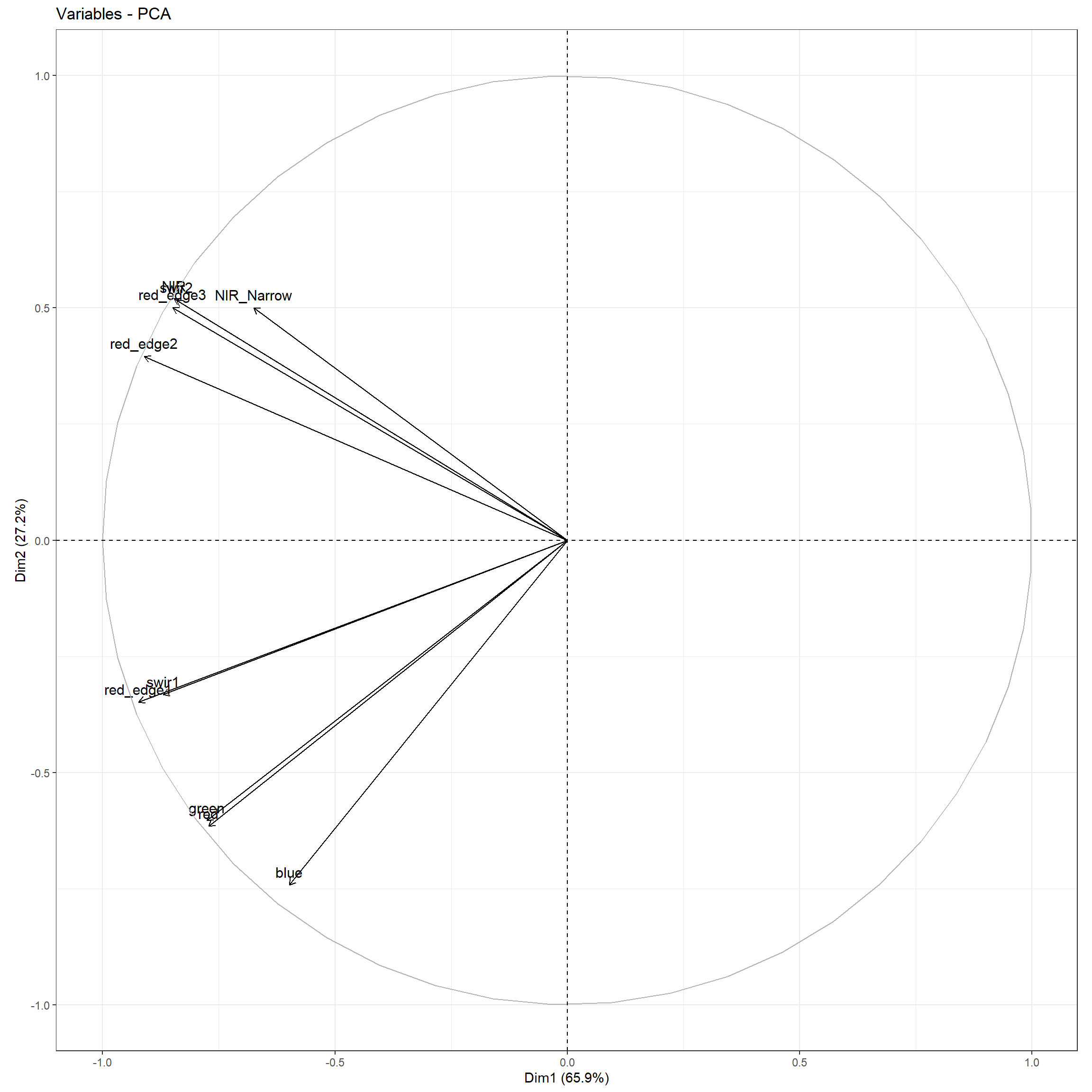 A biplot visualizes how the input predictor variables correlate with the first two principal components. The magnitude of the arrow in the x direction relates to the contribution of the variable to the first principal component while the magnitude in the y direction relates to its contribution to the second principal component. The direction relates to the sign of the Eigenvector for the two principal components. Vectors occurring in the right portion of the plot correspond to input variables that are positively correlated with the first principal component while those in the left are negatively correlated. In our example, all the input predictor variables are negatively correlated with the first principal component. All the Eigenvectors for the first principal component are negative, as is evident in the table above. Vectors occurring in the top portion of the plot correspond to input variables that are positively correlated with the second principal component while those in the lower portion are negatively correlated. Some of the input channels, such as the NIR band, are positively correlated with the second principal component while others, such as the red band, are negatively correlated with the second principal component.