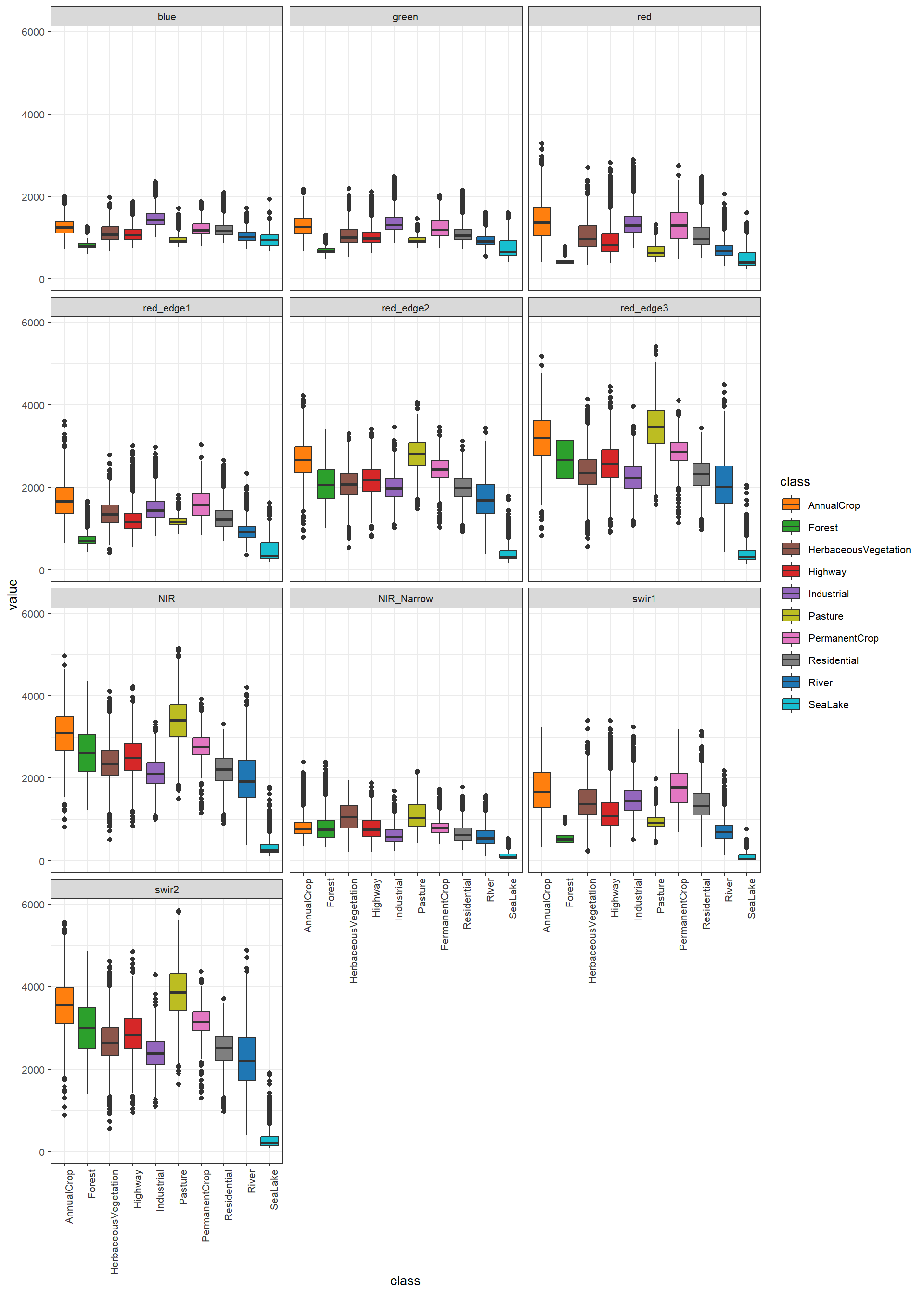from reshape2 is used to convert the table into a tall format with the band values stored in the “value” column, the name of the band stored in the “variable” column, and the class name stored in the “class” column, which is defined as an ID