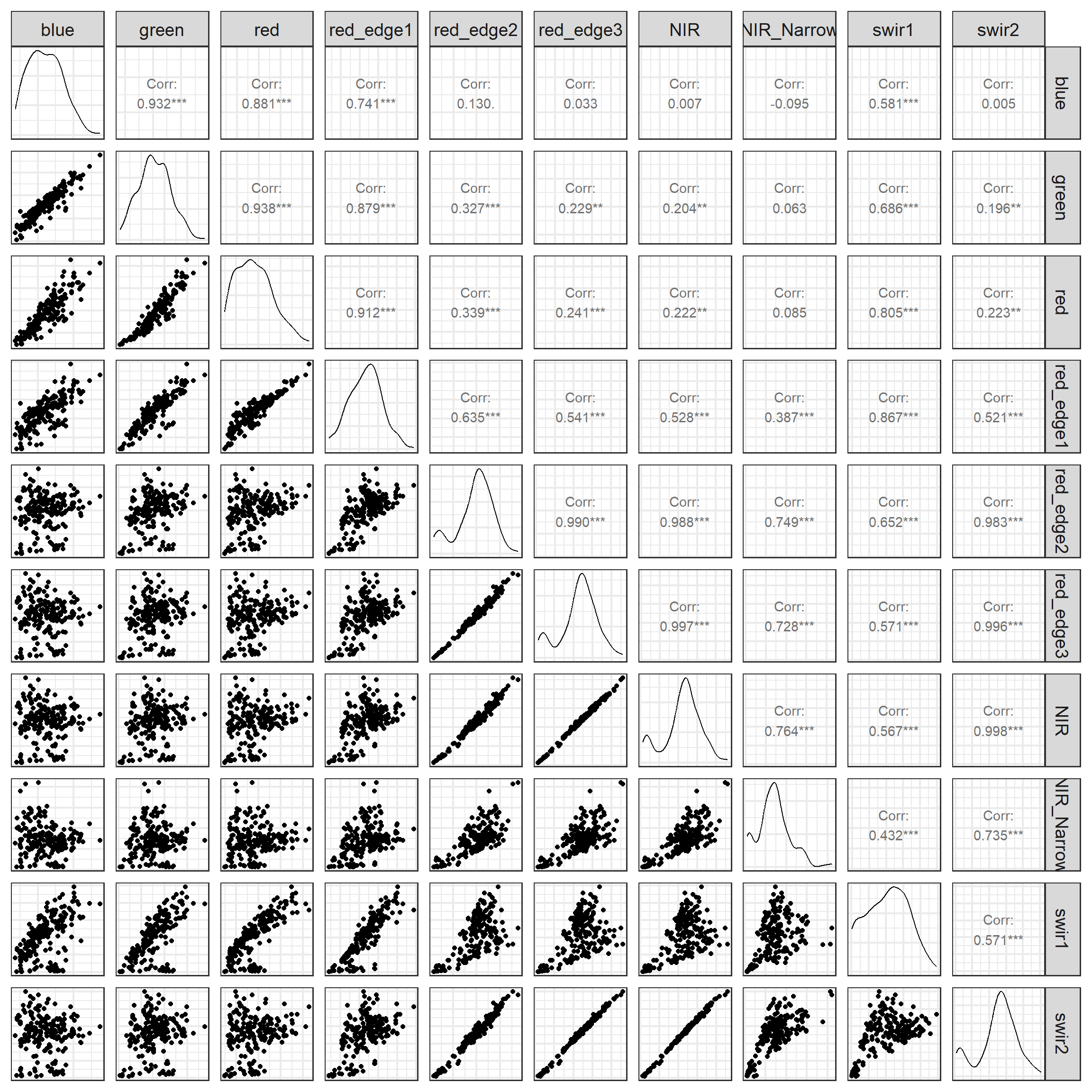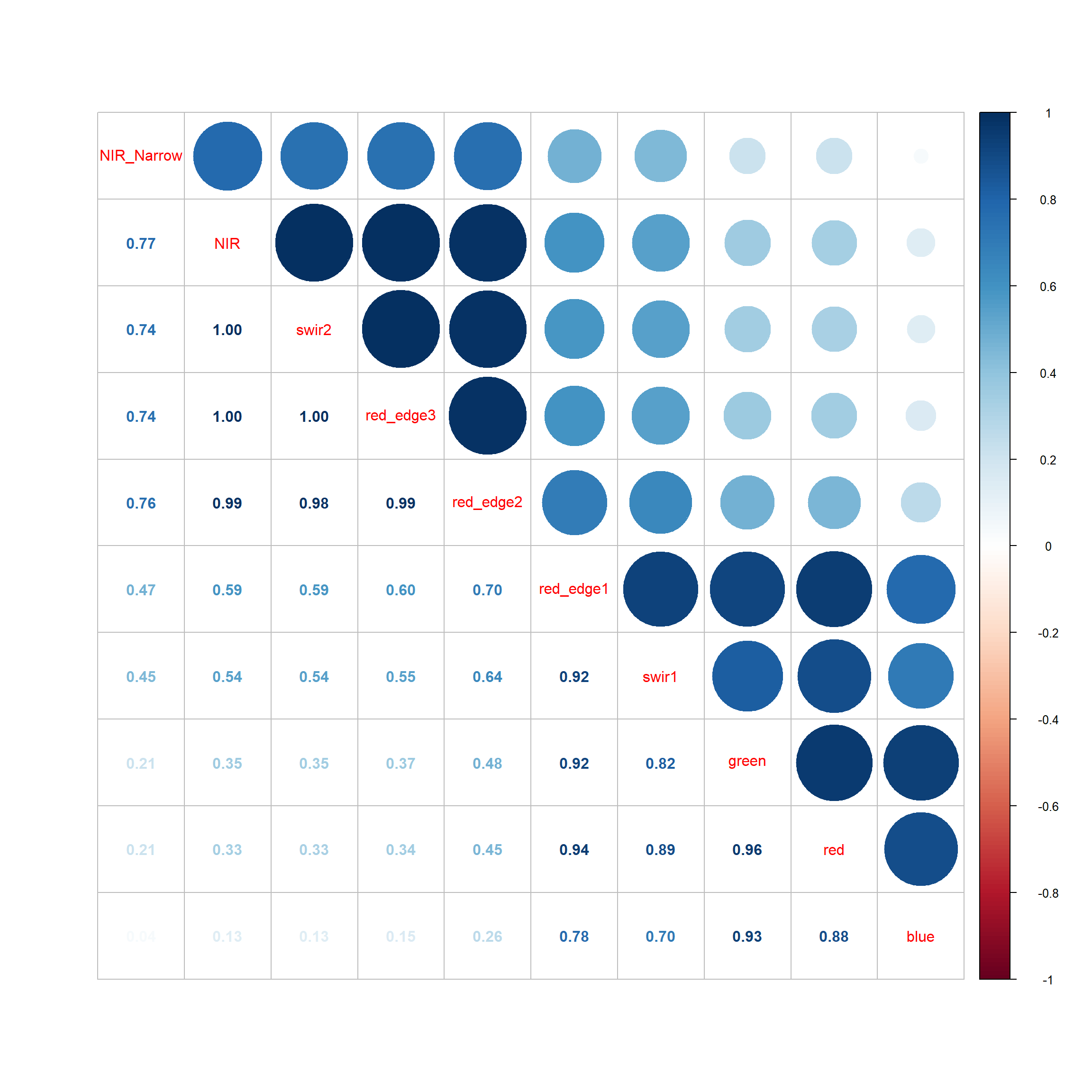Generally, the correlation measures and visualizations suggest a high degree of correlation between the image bands. For example, the red edge 2 and 3 bands are highly correlated with each other and also with the NIR band. More generally, bands tend to be positively correlated.