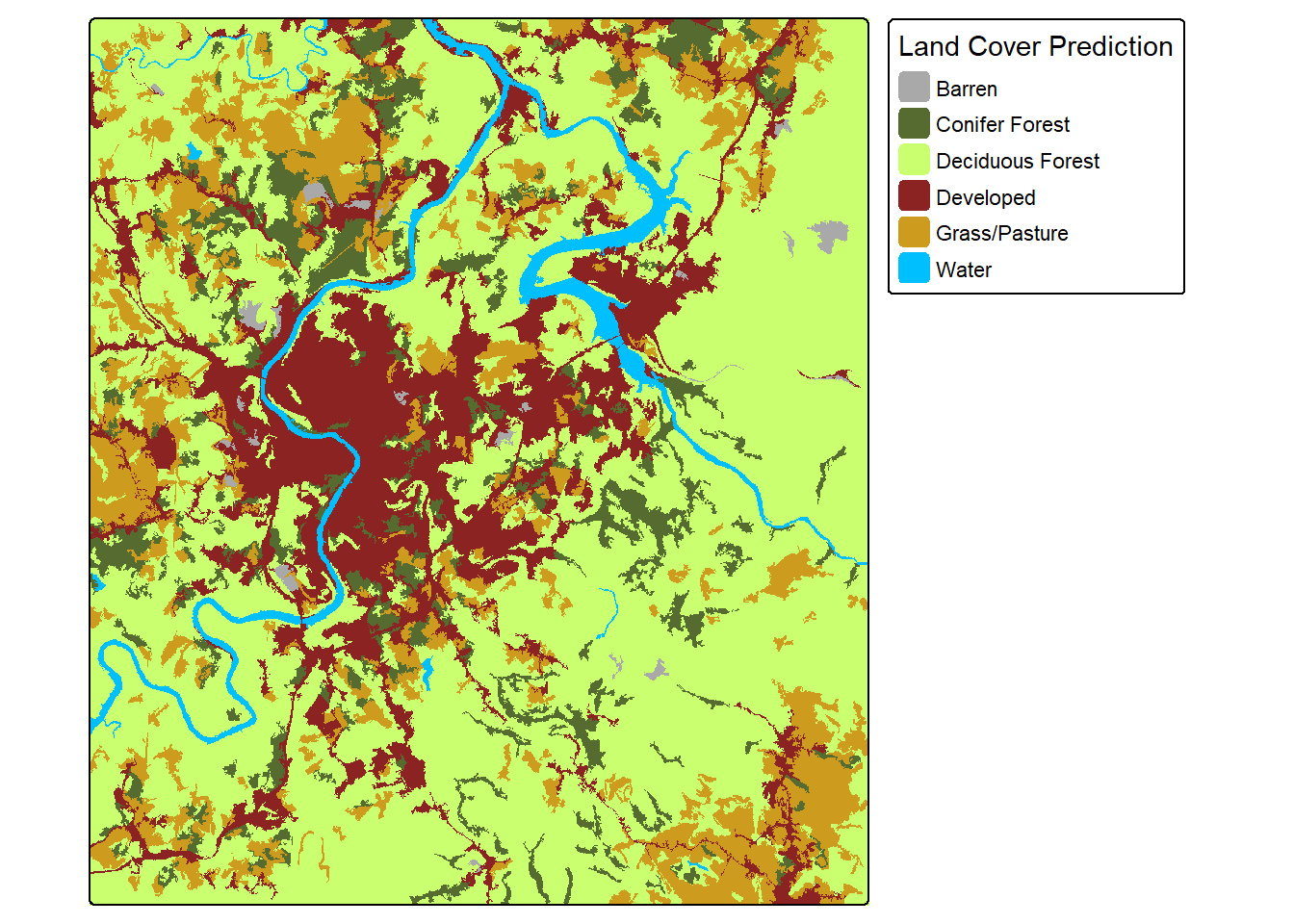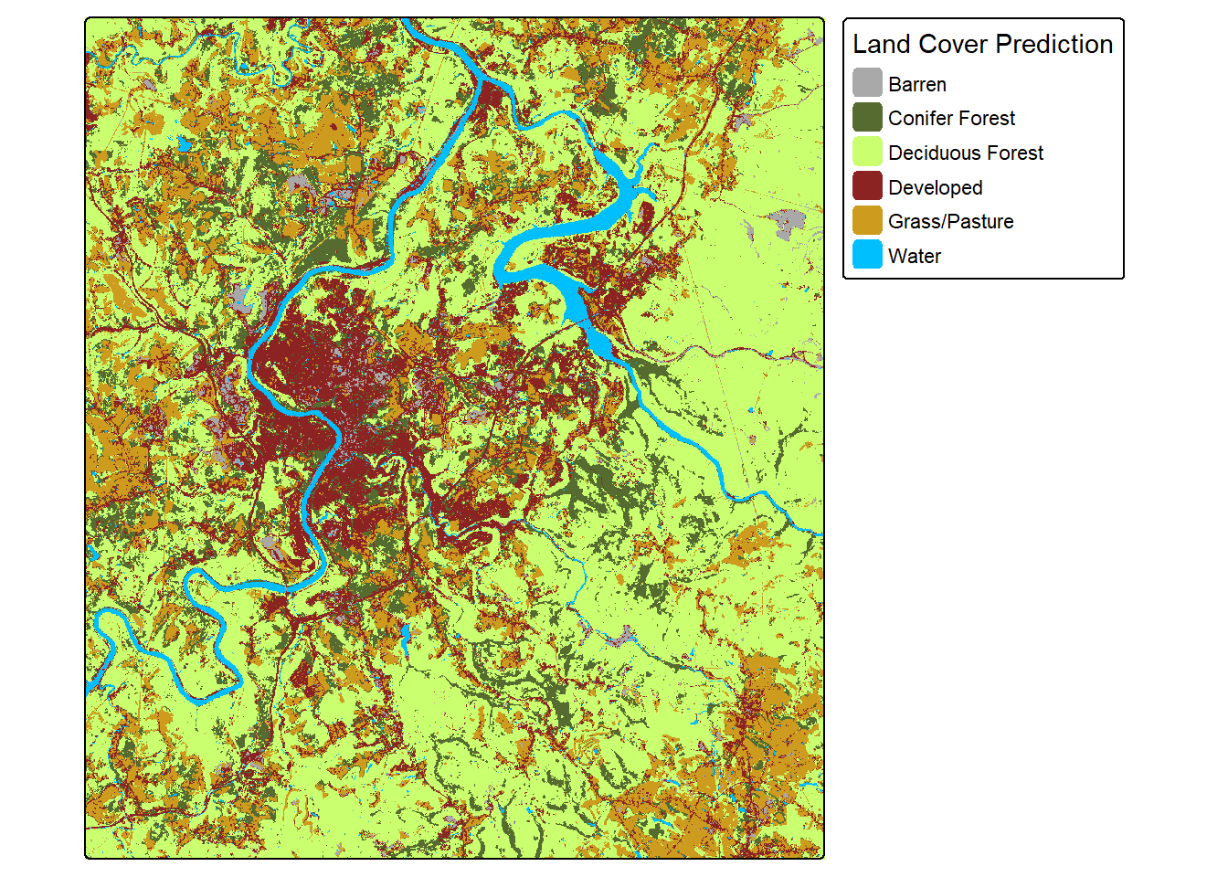 - “Class”: classes being differentiated (“barren”, “crop”, “developed”, “forest”, “pasturegrass”, and “water”)