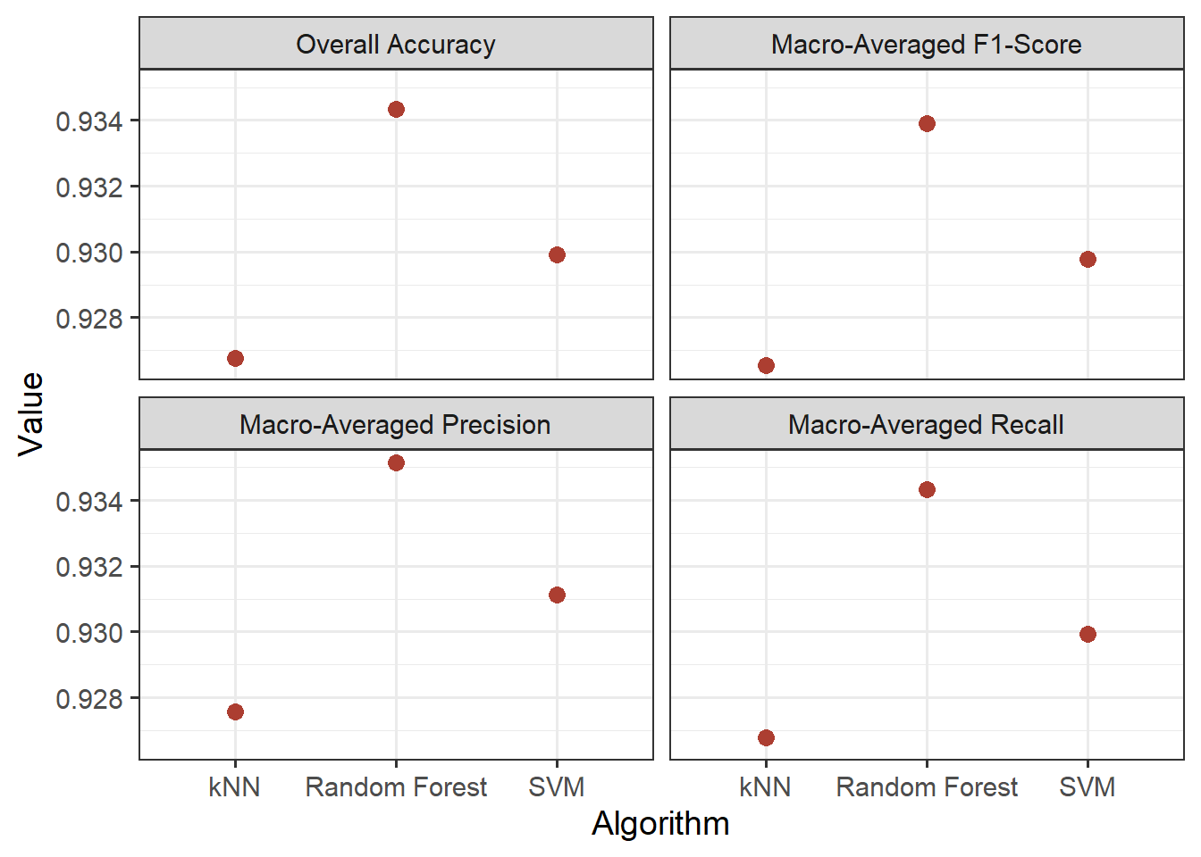 Graphing the results with ggplot2, we can see that the RF algorithm generally provided the best performance as measured using all four assessment metrics. SVM generally outperformed kNN.