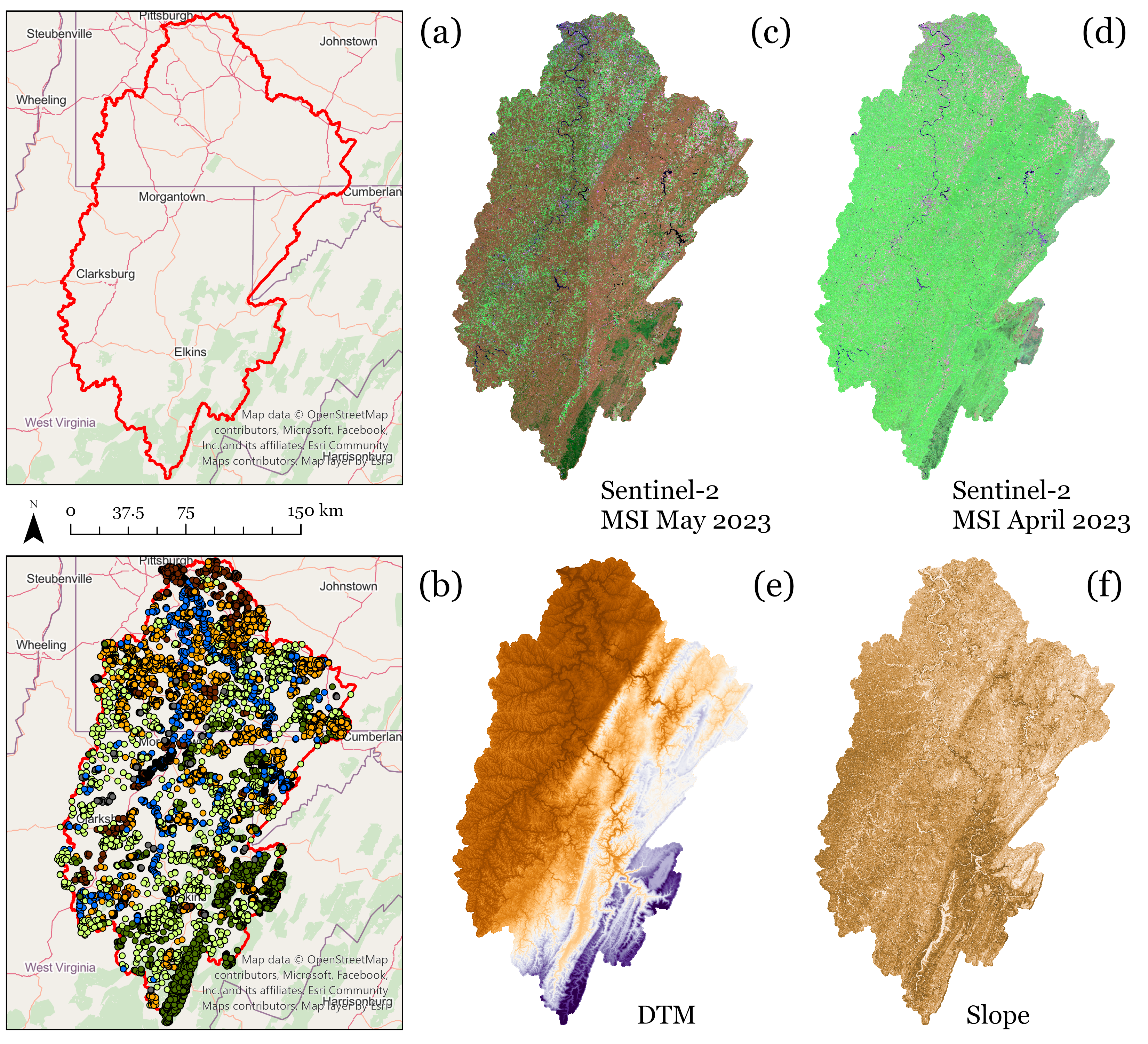 We will primarily make use of the Monongahela River Watershed land cover dataset. This watershed encompass portions of north central West Virginia, western Maryland, and southwestern Pennsylvania. This is a multiclass problem where the predictor variables consist of image band digital number (DN) values for data collected by the Sentinel-2 Multispectral Instrument (MSI) sensor in April 2023 (leaf-off conditions) and May 2023 (leaf-on conditions). We also include elevation, topographic slope, and a topographic position index (TPI) as additional predictor variables. Elevation data were provided by the United States Geological Survey (USGS) National Elevation Dataset (NED). These data were originally generated by students who participated in the Summer 2023 West Virginia Governor’s Computer Science Institute. Additional information about this project can be found here.