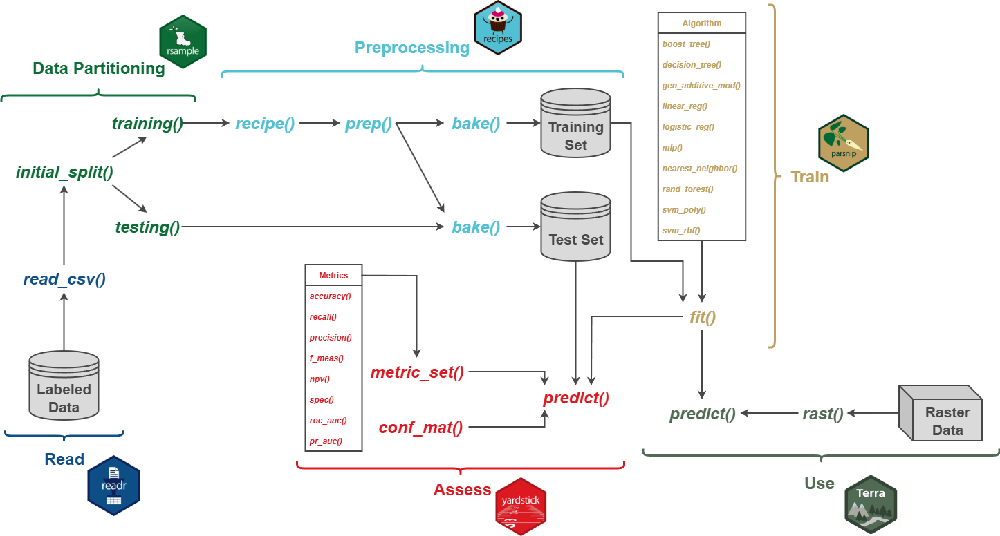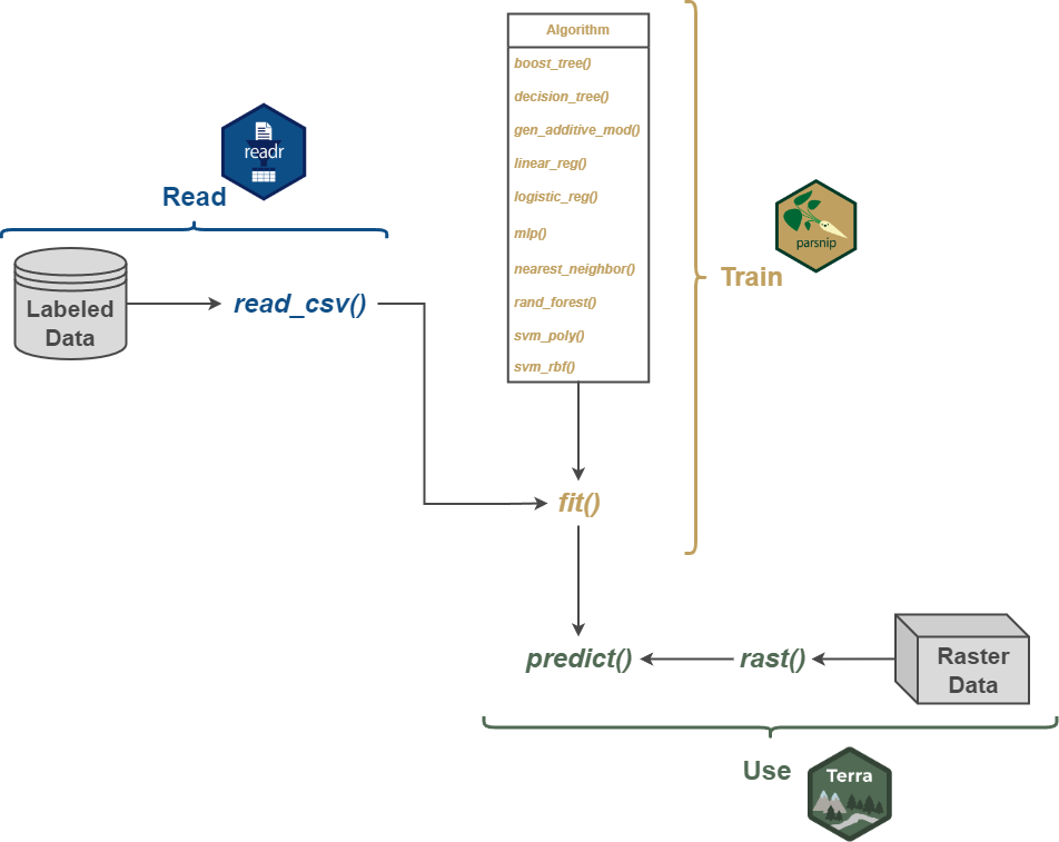 We begin with a very simple workflow that only includes reading in labeled data as a table using readr, which is part of the tidyverse, defining and fitting a model with parsnips, and using the model to make predictions for all cells in a raster extent using terra. Figure 8.1 conceptualizes this process.