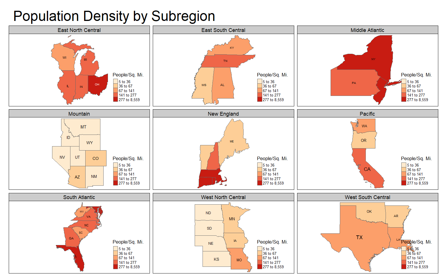 - The states are symbolized using tm_polygons() with the color mapped to the sub-region name. I use a color palette from ColorBrewer2 and set the style to “cat.” I set the title in tm_polygons() to a blank string so that a title is not included in the legend.