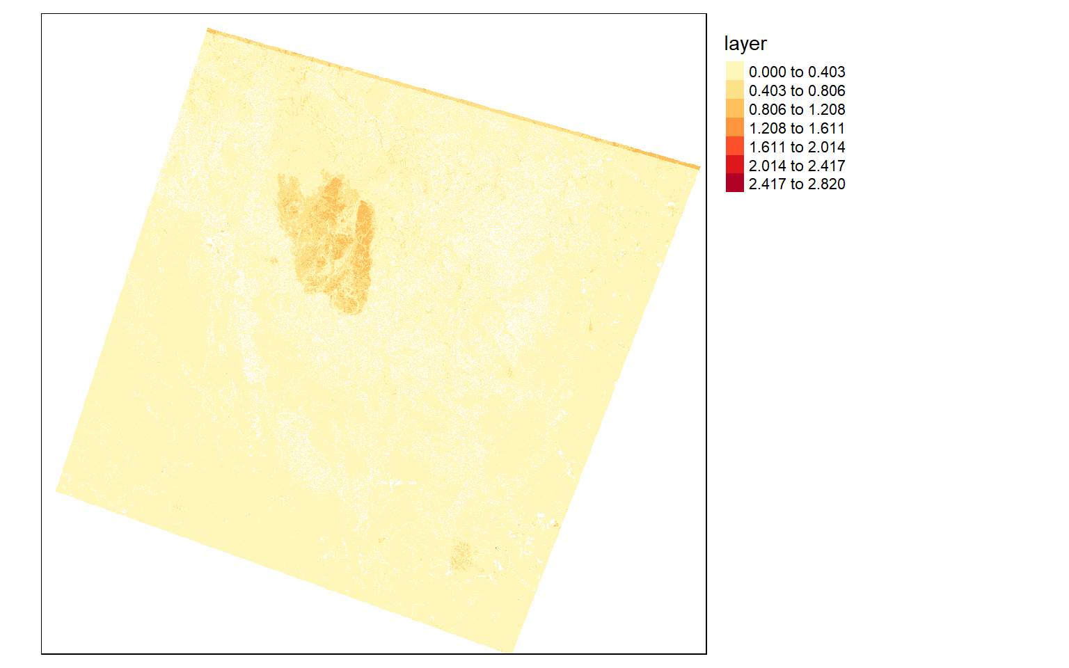 To explore the extent of the fire further, I will use the differenced normalized burn ratio (dNBR). This is obtained from the SWIR and NIR bands. A burned area will have a high SWIR reflectance and a low NIR reflectance in comparison to a forest extent. So, by calculating this index before and after a fire event, I can map the extent and severity of the fire. The code below shows this result. In the dNBR output, high values indicate burned areas.