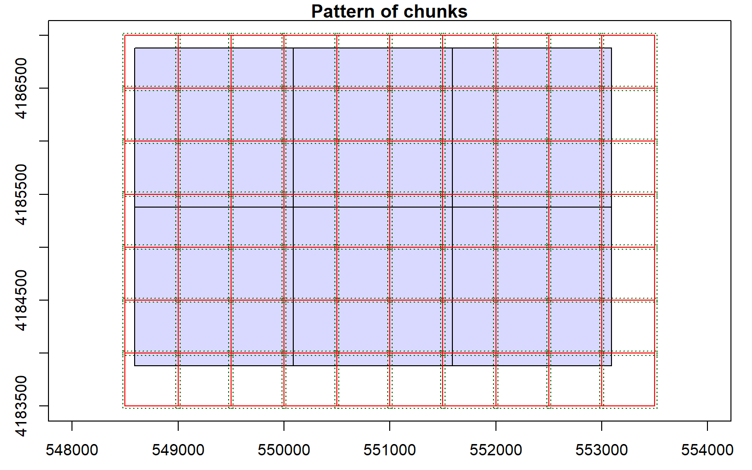Before starting an analysis of all data in a LAS catalog, you will need to define some processing options. In the code block below I am defining processing “chunks” as 500-by-500 meter tiles with a 20 meter overlap. It is generally good to define an overlap to avoid any gaps in generated raster grid surfaces. You will need to experiment with appropriate chunk sizes. This will depend on the point density of the data and the available memory in your computer. The goal is to provide small enough tiles so that you will not run out of memory but not too small to produce a lot of tiles and process the data inefficiently. I am also having the process write a processing summary. The processing options are stored within the LAS catalog object, as demonstrated by summarizing the object.